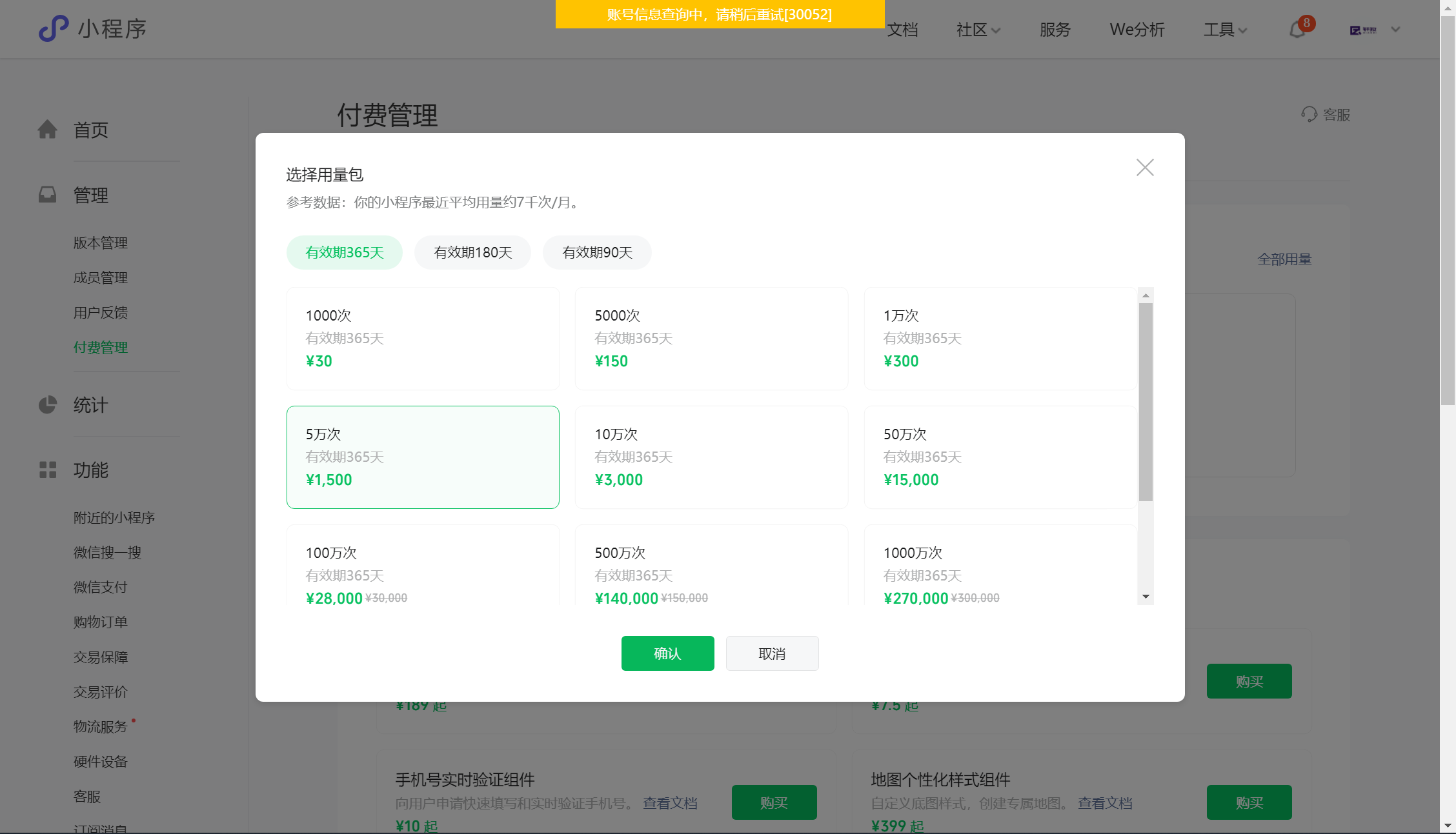 2. 点击左侧菜单「付费管理」;手机号快速验证组件时,提示 账号信息查询中,请稍后重试[30052]