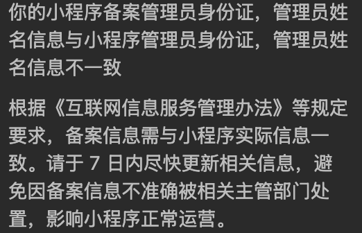 当小程序备案信息与小程序信息不一致时,小程序负责人未及时对小程序备案变更或注销,平台将采用警告、封禁小程序功能、强制注销小程序备案对小程序进一步处置,请及时在【小程序管理后台-设置-小程序备案-变更】发起变更备案。