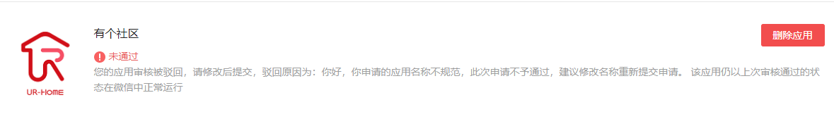 第一次已经创建成功并已开始使用,后期因为需要更换应用logo,就不予通过了(原因是名称不规范),我们的小程序等名称都是叫有个社区,请核实后予以通过,谢谢!