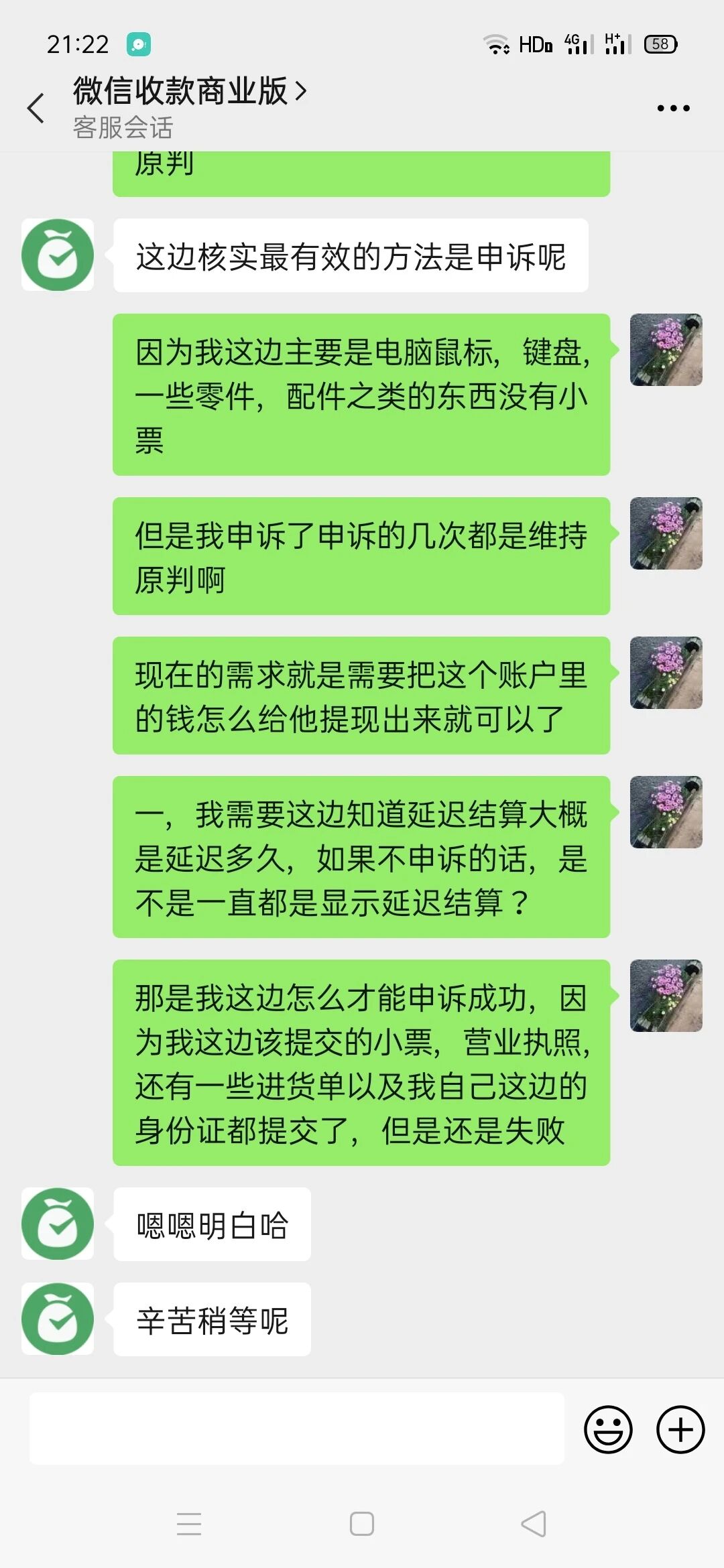 微信商户号异常冻结资金,人工客服电话打不通后台提交材料申诉客服一直驳回!最后客服说延迟结算,我等待很久仍未收到款项,给客户打电话说申诉就行,我申诉两次都是维持原判,还让我提交小票之类的,我说没有,客服说提供进货单也可以,但是一样维持原判。还让我继续申诉,但是我把所有资料都提交还是显示维持原判, 我有营业执照,并且只是再卖鼠标键盘等监控设备,7月27日莫名其妙出现交易异常,无法提现原有的金额,而且并没有出现任何违法行为,商户号1589084201