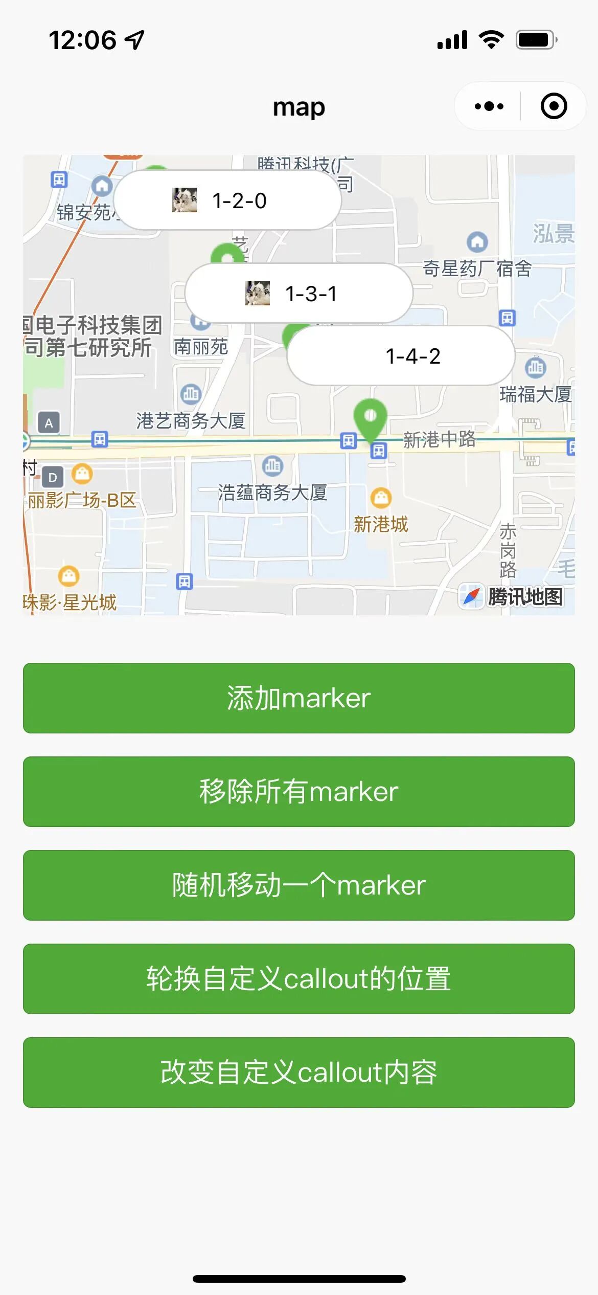 <CoverView slot='callout'> { markers && markers.map(item => { return ( <CoverView className='map-callout' key={item.id} marker-id={item.id}> <CoverView className='callout-title'>渝A66881</CoverView> <CoverView className='callout-msg'>前往现场</CoverView> <CoverView className='callout-btn'>查看</CoverView> </CoverView> ) }) } </CoverView>