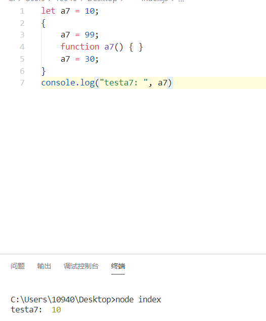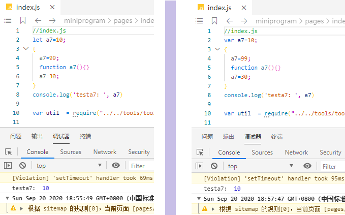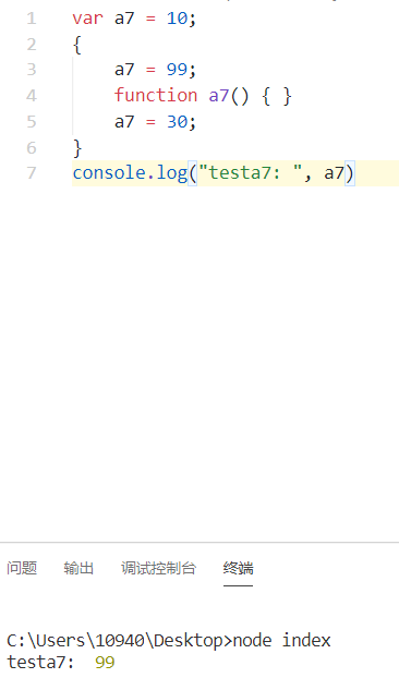 var a7=10; { a7=99; function a7(){} a7=30; } console.log("testa7: ", a7) //微信小程序云函数内:99 //微信小程序内 :10