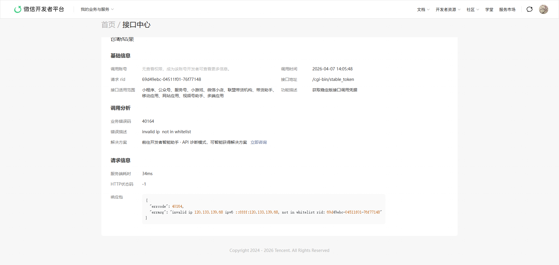 排除下调用appid的后台是否设置了ip白名单。