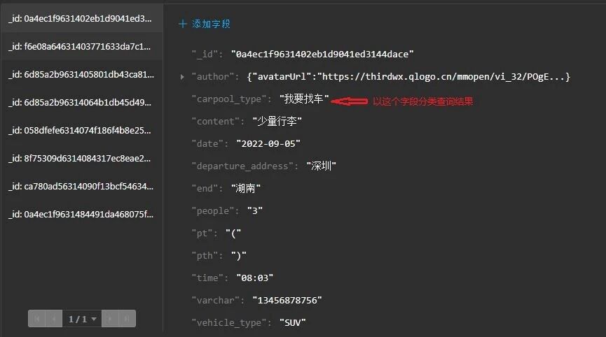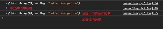 数据库中的carpool_tppe:"我要找车",是发布信息界面选择的发布信息类型,想以这个类型对数据进行分类,显示在导航栏对应的数据中,console.log()打印出来的结果是0,没有获取到数据,如图: