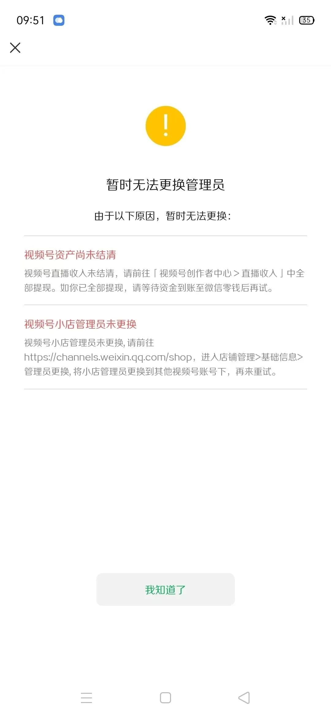 视频号无法更换管理员,直播资产已经提出,还是不能更换