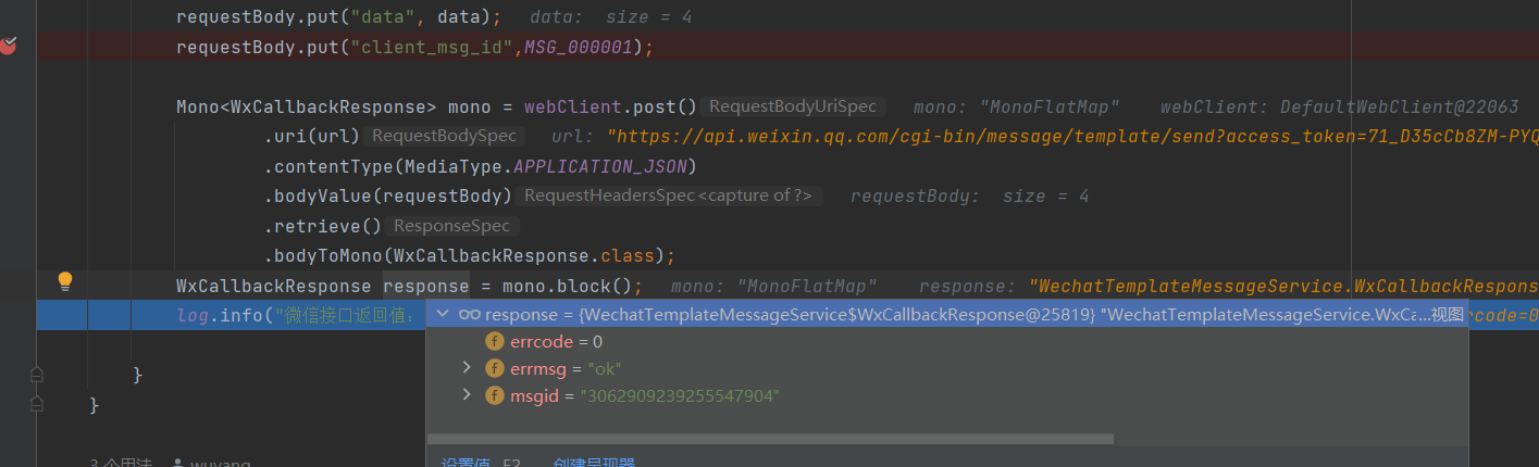 拿到token后请求消息模板接口,第一次成功。微信收到了消息模板推送。