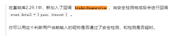我设计一个值来控制 能不能提交. 当你昵称输入框获得焦点时, 这个值变成false , bindnicknamereview 回调通过后, 变成true. 如果用户改完昵称直接提交,此时bindnicknamereview 回调还没来得及完成 用户就提交的话, 是false, 你可以提示用户 昵称审核中 .