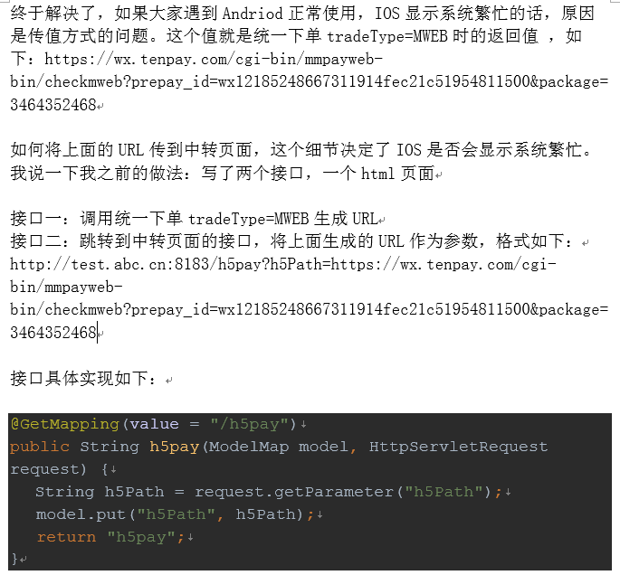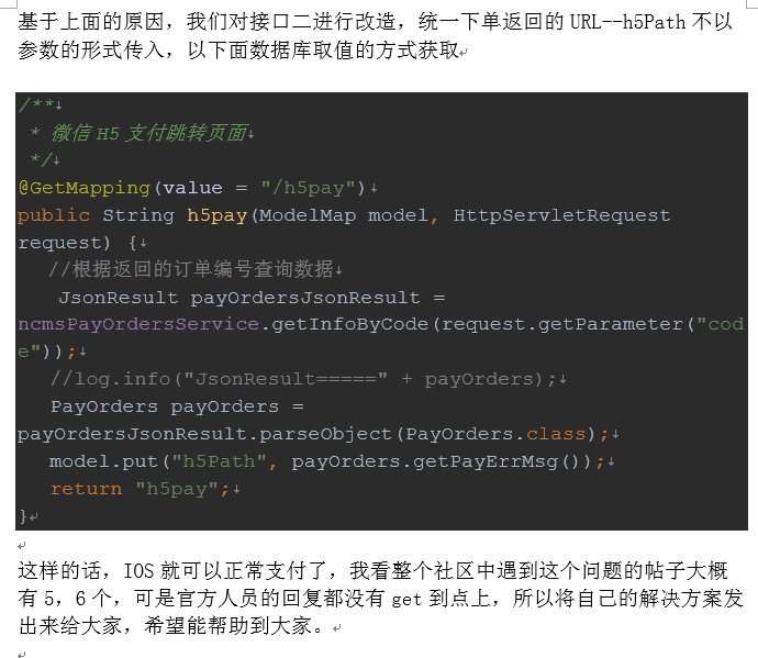 今天也遇到这个问题了,安卓系统oppo/uc/QQ浏览器测试没有问题,在ios上使用safari浏览器就会提示系统错误,我是通过ajax返回json格式数据来获取后台返回的mweb_url如下,