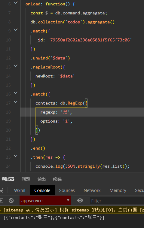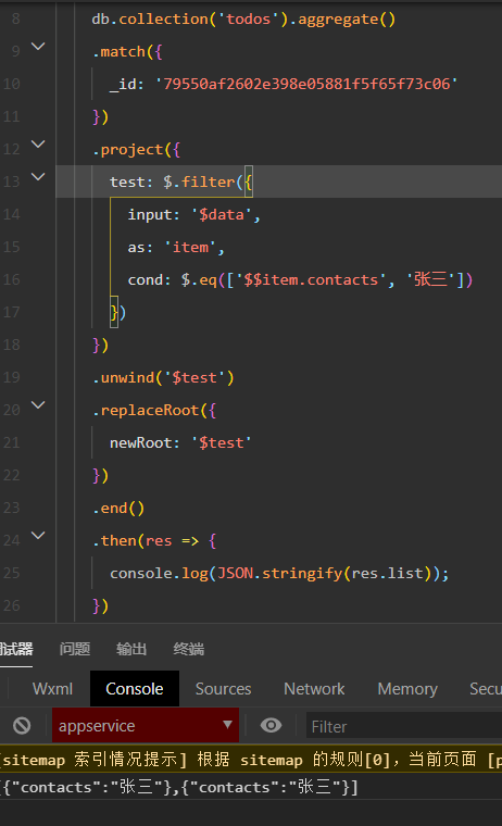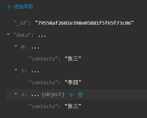 aggregate().unwind('$data').match({'data.contacts':'张三'})