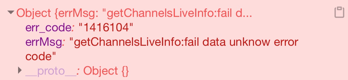 视频号、小程序属于同一主体,真机调用wx.getChannelsLiveInfo报错1416104。视频号正常运营中,测试直播(仅开发可见)均可正常开启。