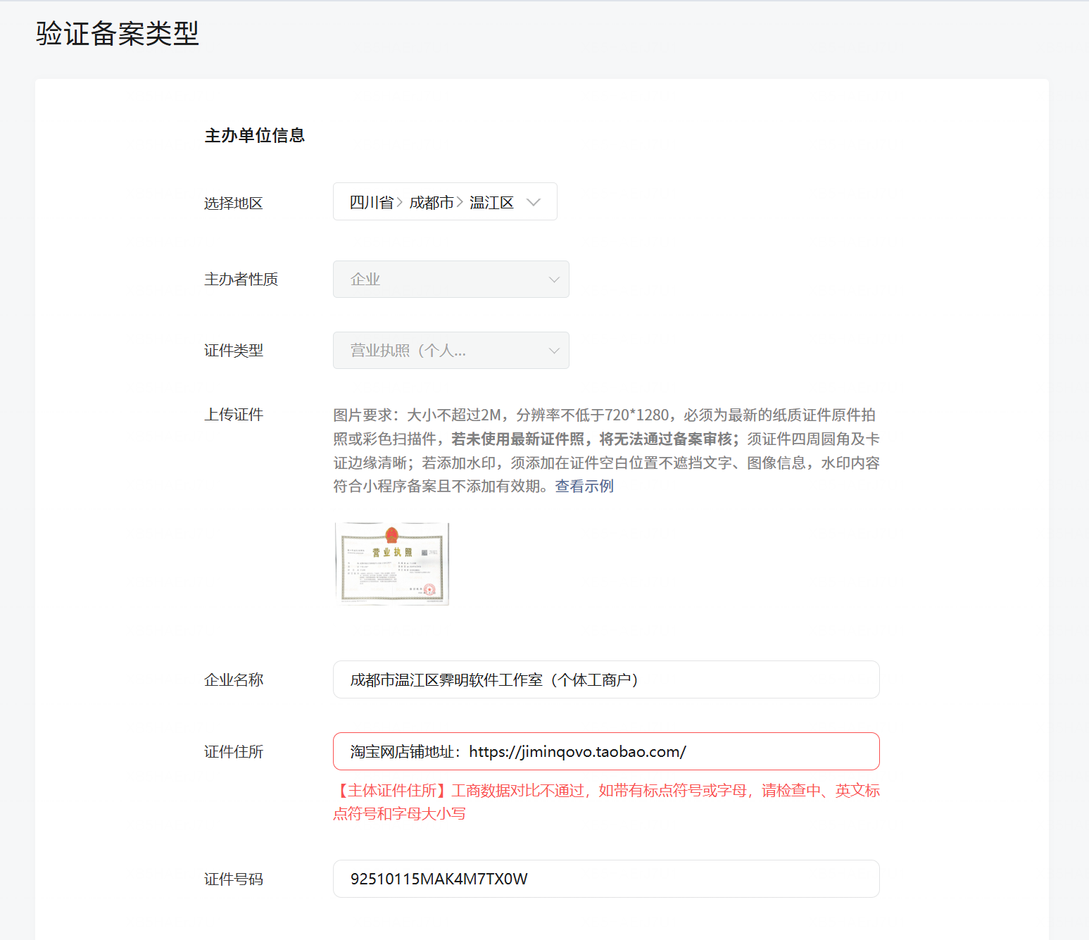 营业执照是网店,地址是网址,在注册小程序的时候,地址那一栏显示工商数据对比不通过,无法填写,要怎么办?