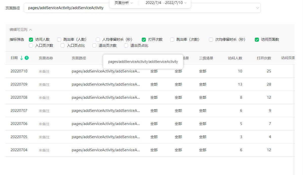 日访问页面数: 单日访问小程序页面的总数量,同一用户多次访问同一页面算为多次。
