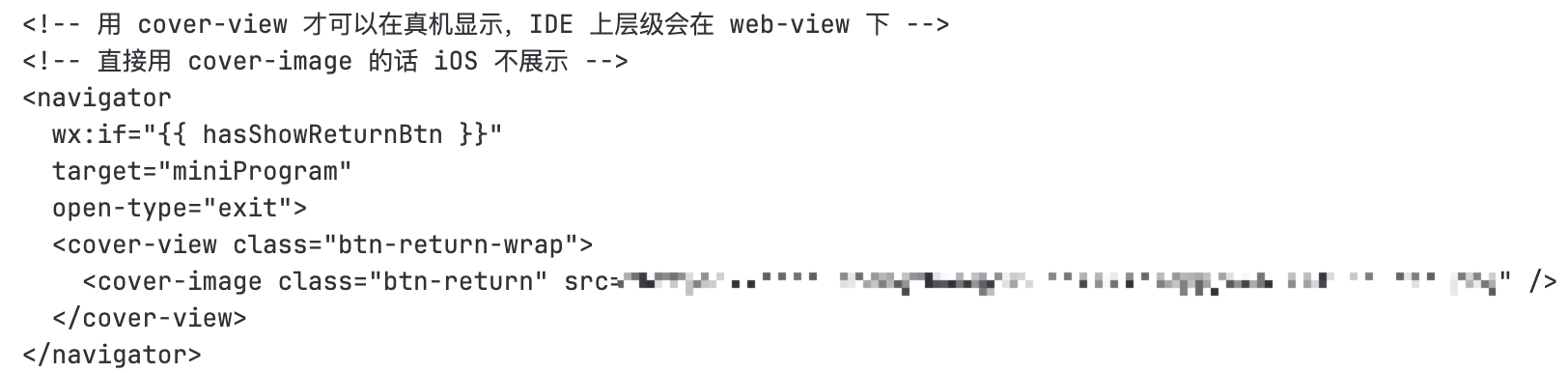 navigator 和 cover-view 和 cover-image做一个按钮(固定定位、z-index: 999999)覆盖在 webview 上,用户点击按钮进行返回这里需要注意的是,开发工具上查看 webview 是会覆盖着按钮的,但是真机上按钮可以覆盖住 webview