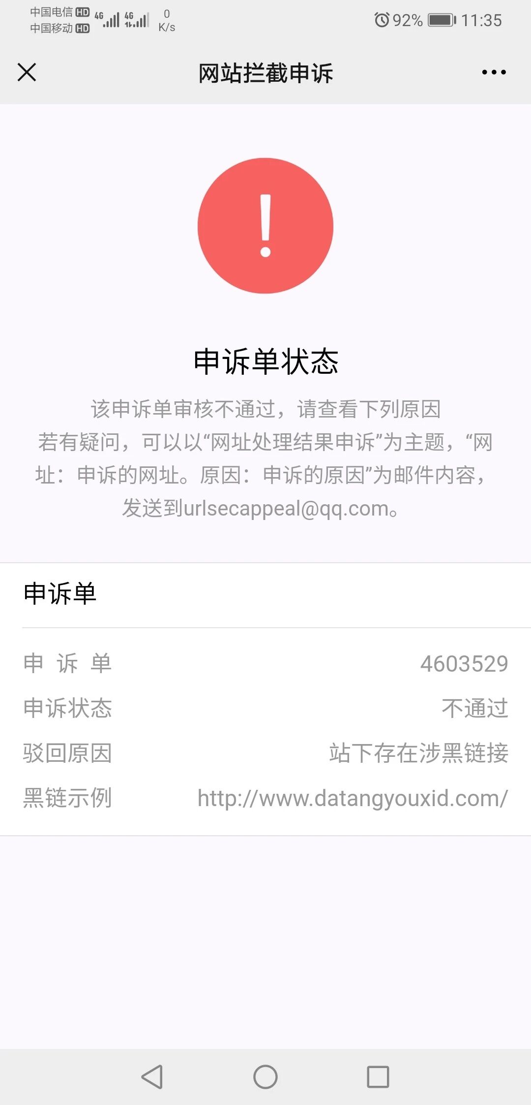 网站http://www.datangyouxid.com/被微信拦截,提交申述后反馈,站下存在涉黑链接,网站只有一个页面,没有任何非法链接,请大家看一下!