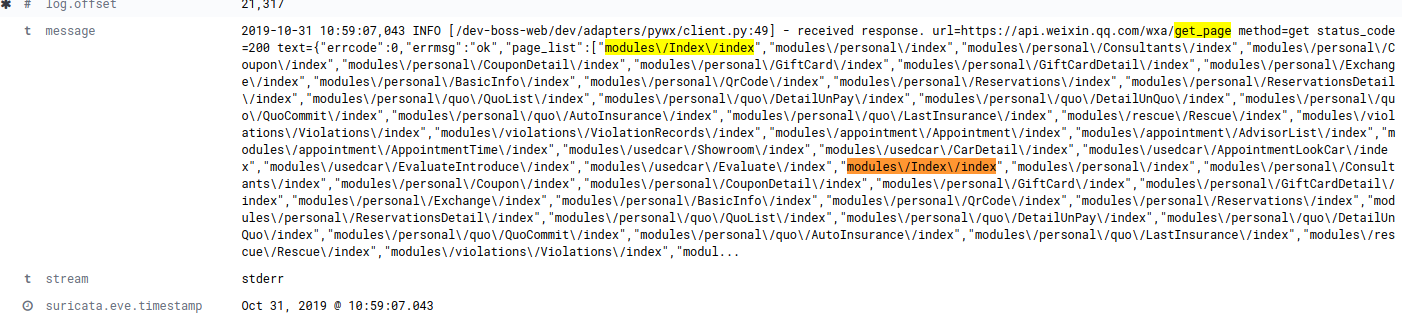 2019-10-31 10:45:11,140 INFO [/dev-boss-web/dev/adapters/pywx/client.py:49] - received response. url=https://api.weixin.qq.com/wxa/get_page method=get status_code=200 text={"errcode":0,"errmsg":"ok","page_list":["modules\/Index\/index","modules\/personal\/index","modules\/personal\/Consultants\/index","modules\/personal\/Coupon\/index","modules\/personal\/CouponDetail\/index","modules\/personal\/GiftCard\/index","modules\/personal\/GiftCardDetail\/index","modules\/personal\/Exchange\/index","modules\/personal\/BasicInfo\/index","modules\/personal\/QrCode\/index","modules\/personal\/Reservations\/index","modules\/personal\/ReservationsDetail\/index","modules\/personal\/quo\/QuoList\/index","modules\/personal\/quo\/DetailUnPay\/index","modules\/personal\/quo\/DetailUnQuo\/index","modules\/personal\/quo\/QuoCommit\/index","modules\/personal\/quo\/AutoInsurance\/index","modules\/personal\/quo\/LastInsurance\/index","modules\/rescue\/Rescue\/index","modules\/violations\/Violations\/index","modules\/violations\/ViolationRecords\/index","modules\/appointment\/Appointment\/index","modules\/appointment\/AdvisorList\/index","modules\/appointment\/AppointmentTime\/index","modules\/usedcar\/Showroom\/index","modules\/usedcar\/CarDetail\/index","modules\/usedcar\/AppointmentLookCar\/index","modules\/usedcar\/EvaluateIntroduce\/index","modules\/usedcar\/Evaluate\/index","modules\/Index\/index","modules\/personal\/index","modules\/personal\/Consultants\/index","modules\/personal\/Coupon\/index","modules\/personal\/CouponDetail\/index","modules\/personal\/GiftCard\/index","modules\/personal\/GiftCardDetail\/index","modules\/personal\/Exchange\/index","modules\/personal\/BasicInfo\/index","modules\/personal\/QrCode\/index","modules\/personal\/Reservations\/index","modules\/personal\/ReservationsDetail\/index","modules\/personal\/quo\/QuoList\/index","modules\/personal\/quo\/DetailUnPay\/index","modules\/personal\/quo\/DetailUnQuo\/index","modules\/personal\/quo\/QuoCommit\/index","modules\/personal\/quo\/AutoInsurance\/index","modules\/personal\/quo\/LastInsurance\/index","modules\/rescue\/Rescue\/index","modules\/violations\/Violations\/index","modul...
