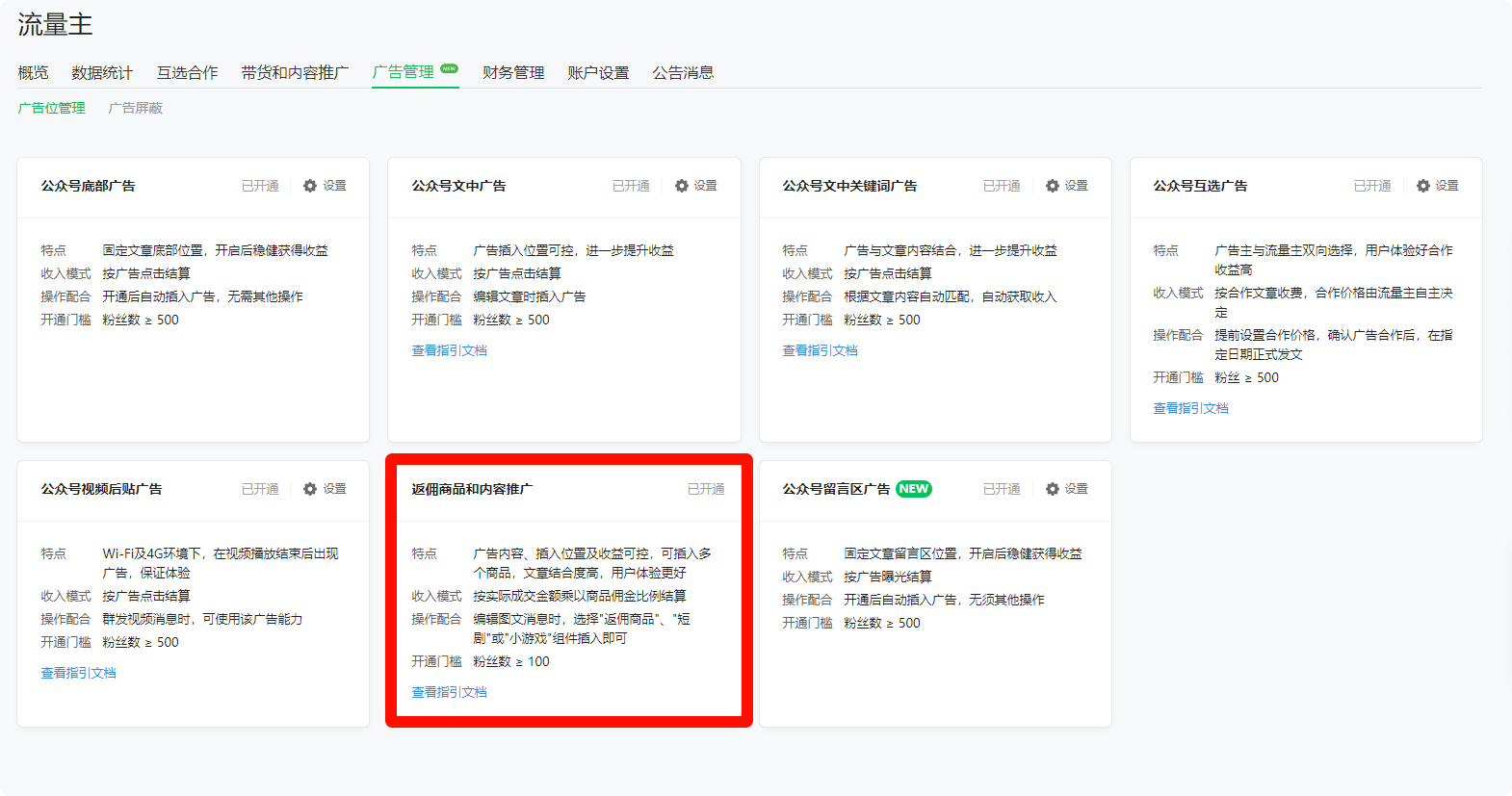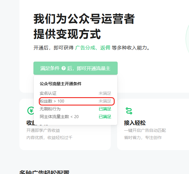 你好,请完成实名认证后,再重新查看粉丝数校验情况。其中,粉丝数达到 100 人,可开通公众号返佣商品能力;粉丝数达到500人,可开通公众号程序化广告能力。