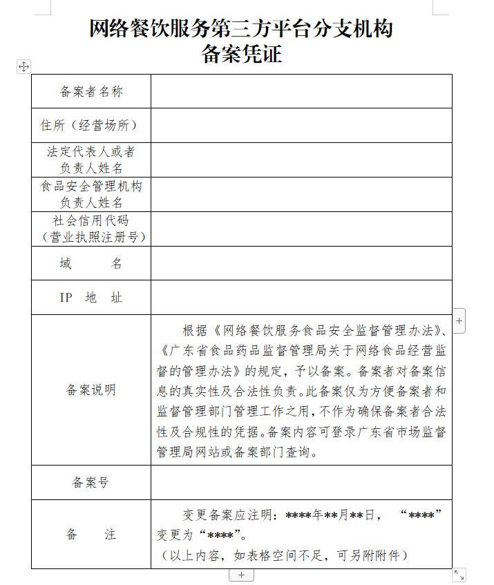 网络餐饮服务第三方平台提供者设立从事网络餐饮服务分支机构的,应当在设立后30个工作日内,向所在地县级食品药品监督管理部门备案。备案内容包括分支机构名称、地址、法定代表人或者负责人姓名等。