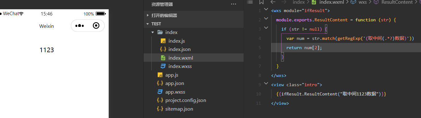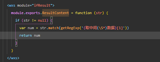 <wxs module="ifResult"> module.exports.ResultContent = function (str) { if (str != null) { var num = str.match(getRegExp('(取中间(\S*)数据)[1]')) return num } } </wxs>