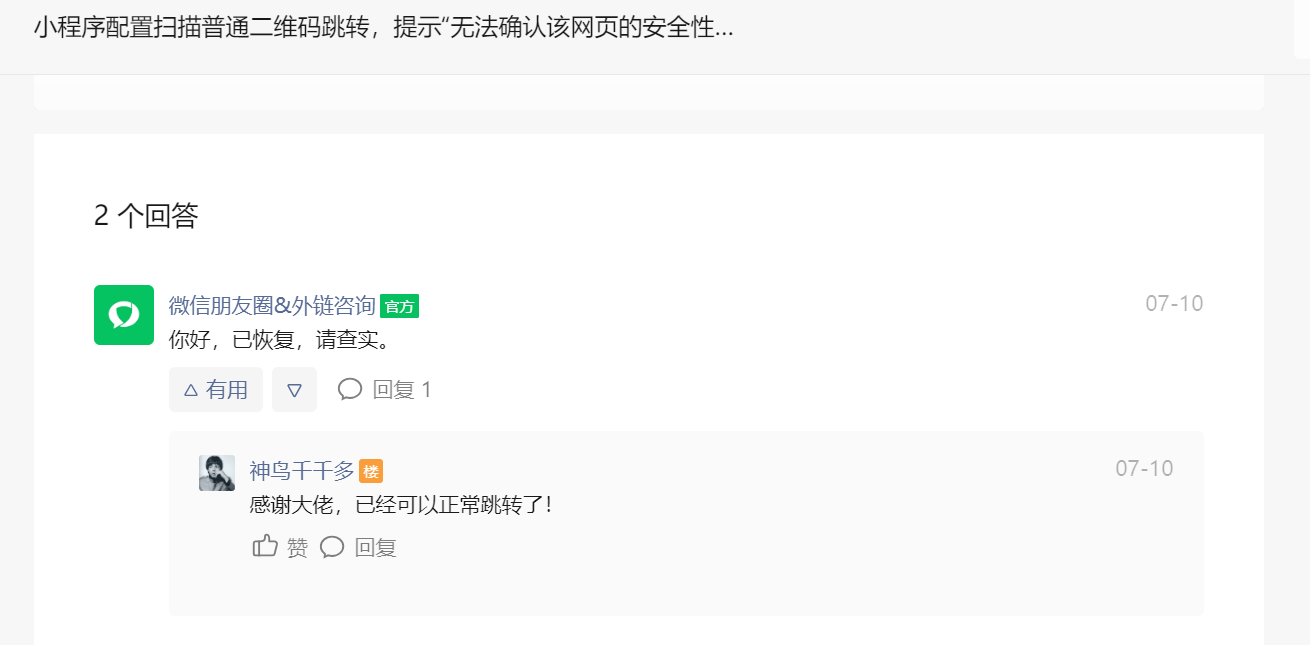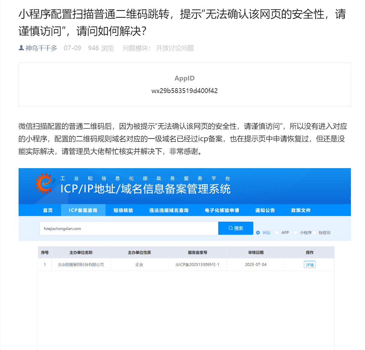 配置的二维码规则域名之前因被提示“无法确认网页安全性”而无法跳转,但管理员大佬已于当月10号帮助解决,不过最近扫码时发现域名又因为提示网页包含色情内容而被拦截。已经确认一级域名备案通过,链接中不存在任何色情内容也没有任何网页指向,此二级域名链接(tuyi.futejiachongdian.com)仅为小程序提供接口,烦请管理员大佬再帮忙核实并解决下,非常感谢。