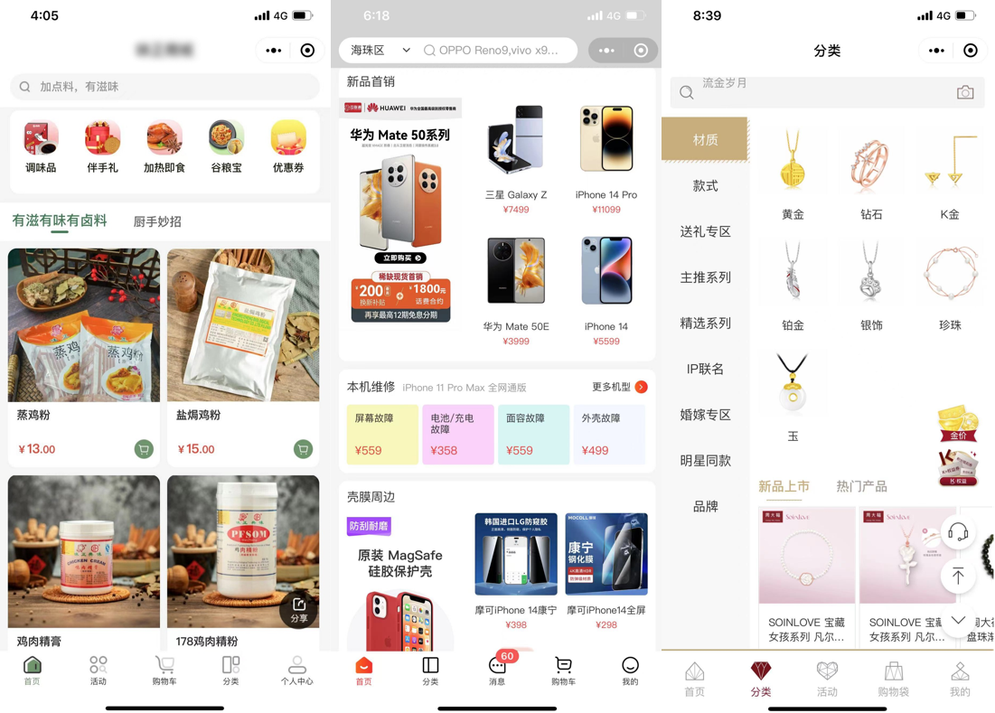 提供实物商品在线销售及配送的小程序,如提供食品饮料、数码3C、珠宝玉石等商品的在线销售。