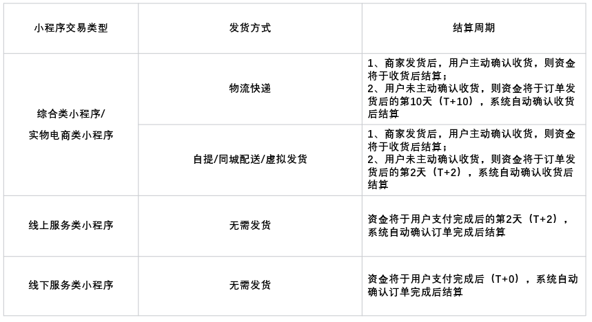 不同的小程序交易类型和发货方式对应不同的订单结算周期,详见下表: