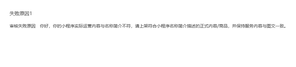 你好,经核实,小程序实际运营内容与名称不符,请上架符合小程序名称简介描述的正式内容/商品,并保持服务内容与图文一致。