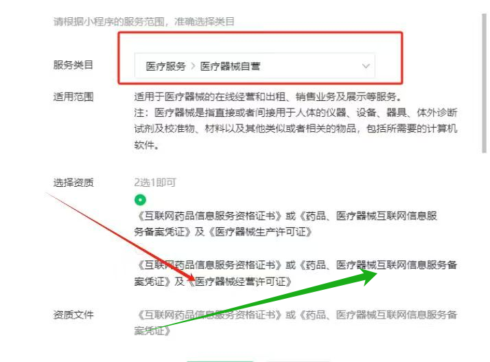 自营选择这个:https://developers.weixin.qq.com/miniprogram/product/material/#%E5%8C%BB%E7%96%97%E6%9C%8D%E5%8A%A1
