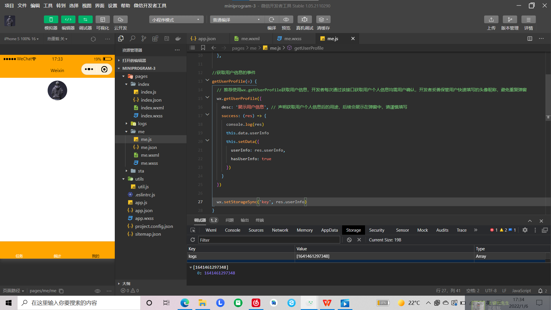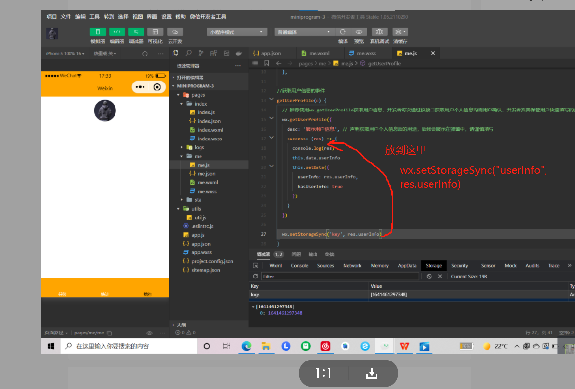 wx.getUserProfile( ... success: res=>{ wx.setStorageSync('key', res.userInfo) ... } )报个班把js基础好好学学吧