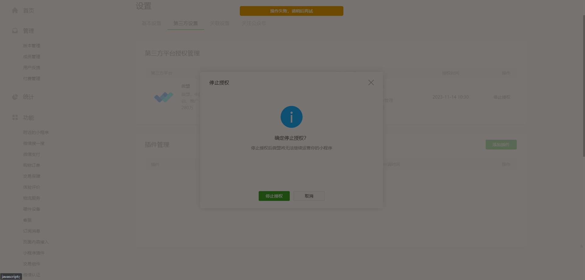 停止,第三方平台授权管理中,点击,停止授权,报错