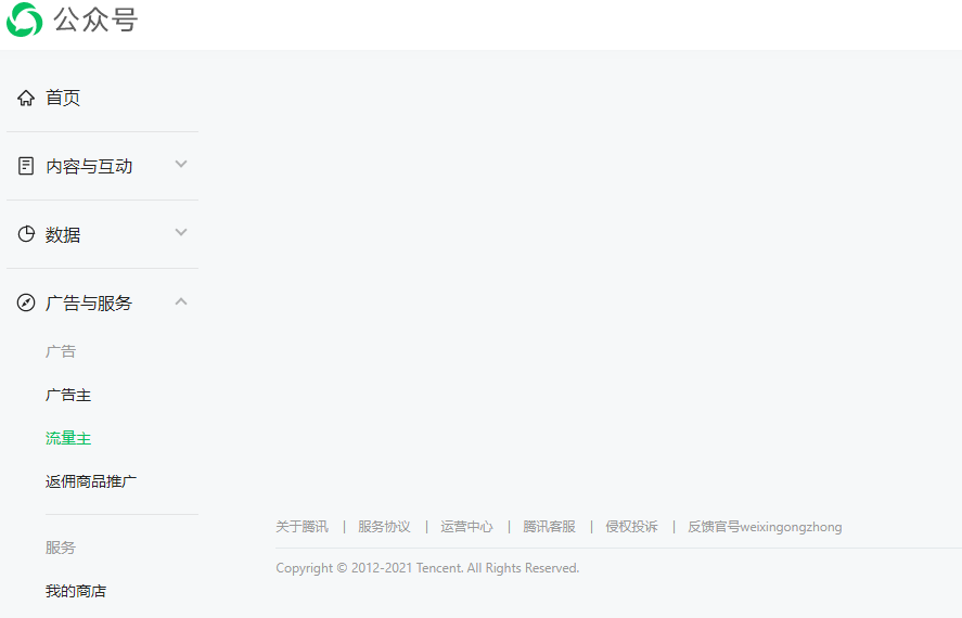 公众号里边>广告与服务>流量主——打开没有任何字符。有好几天了。