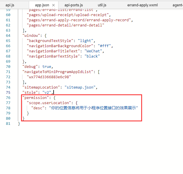 wx.getLocation开发工具调用没问题,真机测试报错,但是app.json已经写了permission["scope.userLocation"].desc的配置了,编写格式与官方文档完全一样