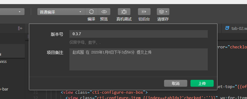 上述步骤操作完以后,再次重复操作时,我们是期望版本号那个输入框要能记住上一次提交的版本号的,这样方便我们有序迭代,这个功能我记得有一个版本的开发者工具实现过,现在这个版本又没有了!