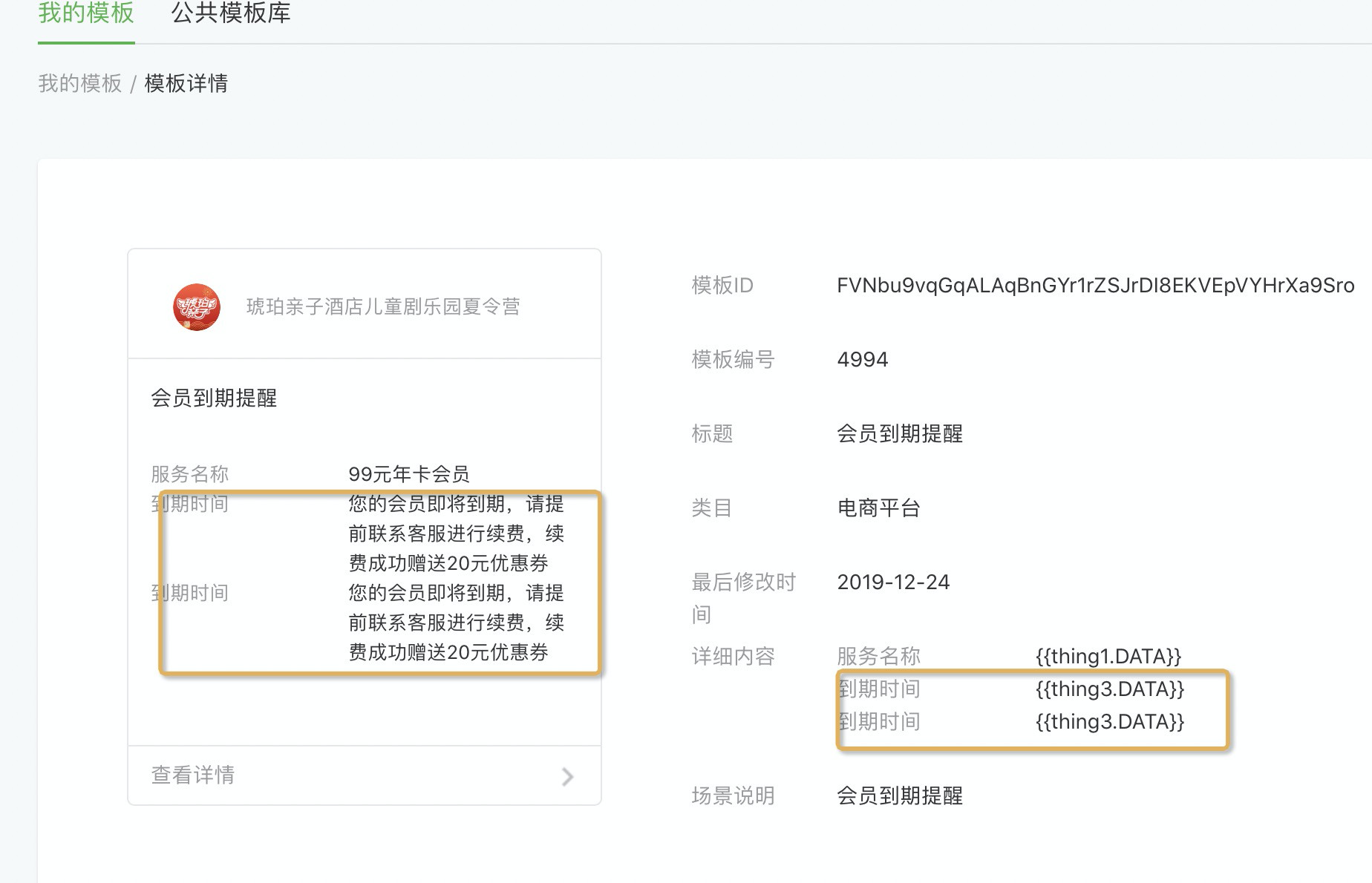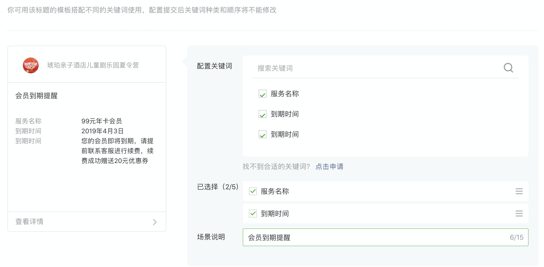 模板申请时是服务名称,到期时间,温馨提示三个字段,审核通过,发现“到期时间”有两个,但是无法删除,在已选择中只有两个