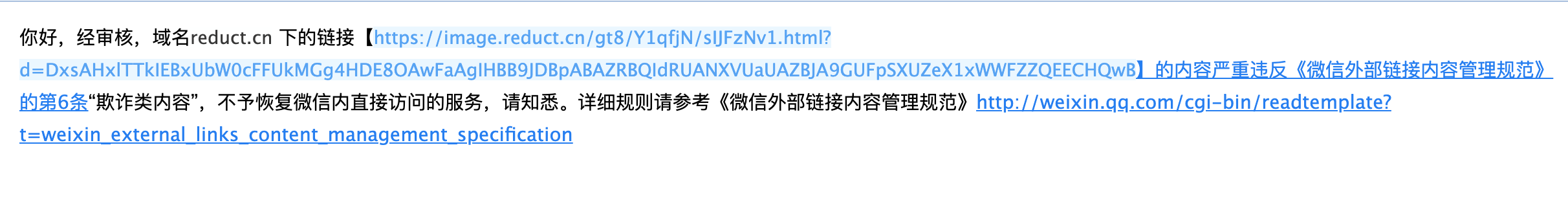您好,我们的网站在 第一次内部测试阶段 测试分享功能的时候域名被封,我们尝试多次提及申请解封,并且发送了5次邮件请求申请解封均无果;