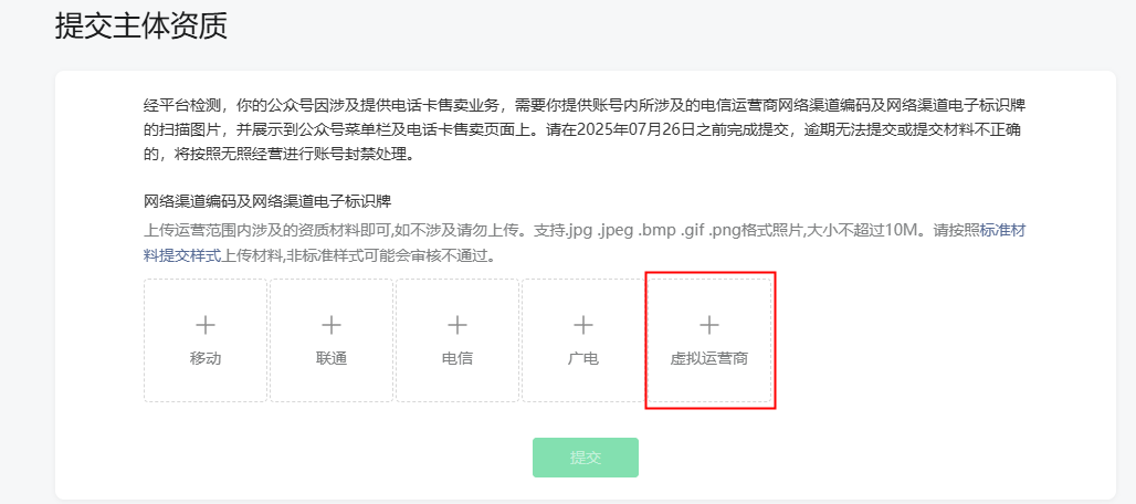 我们的公司主体是世纪蜗牛通信科技有限公司,是国内的一家持牌虚拟运营商,工信部可查。因为我们在服务号上提供了我们自己产品的电话卡销售和充值业务,现在要求我们补充提交网络渠道电子标识牌。但是我们自己属于最后一类,虚拟运营商。所以需要我们自己给自己颁发网络渠道电子标识牌上传么?