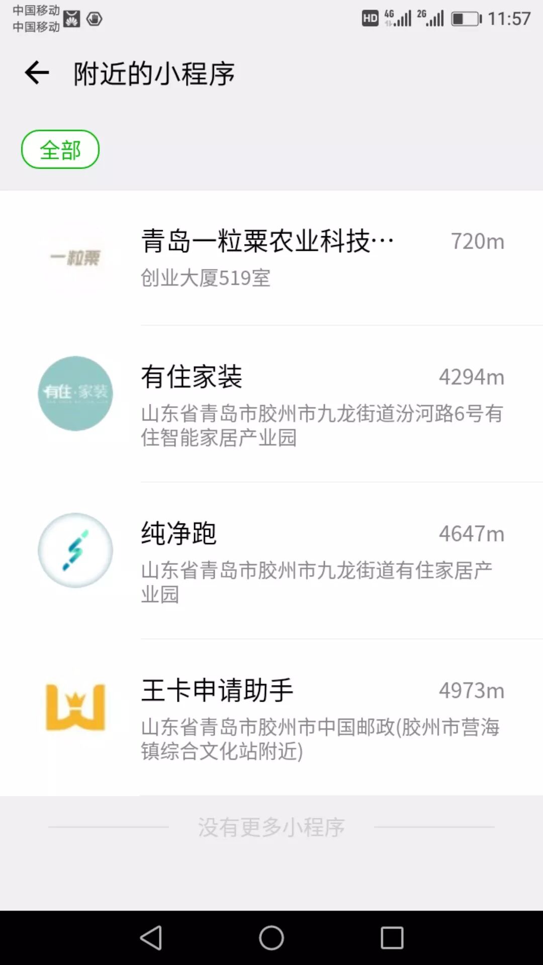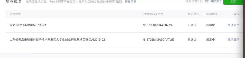 地址二:山东省青岛市胶州市经济技术开发区大学生创业孵化基地苗圃区AM019-021,这个也通过了审核在显示中,附近小程序却搜索不到我的小程序。