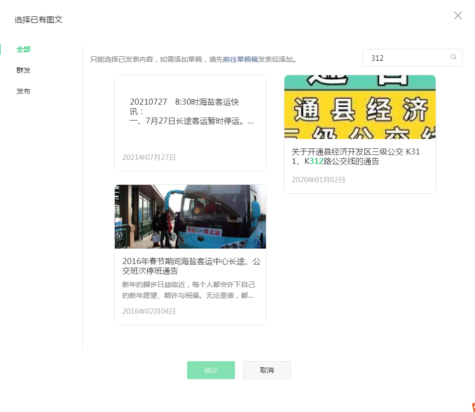 你好,你可以在全部这里输入文章标题,需要已发表(发布或者群发)才可以搜索到