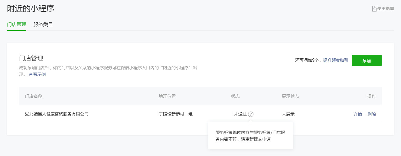 服务类目选择的生活服务类目下的信息咨询中心审核通过了,门店服务中选择自定义的健康咨询服务就不通过,提示我服务标签跳转内容与服务标签门店服务内容不符,请求解答!!(营业执照的经营范围也是信息咨询类的,详情见下图)