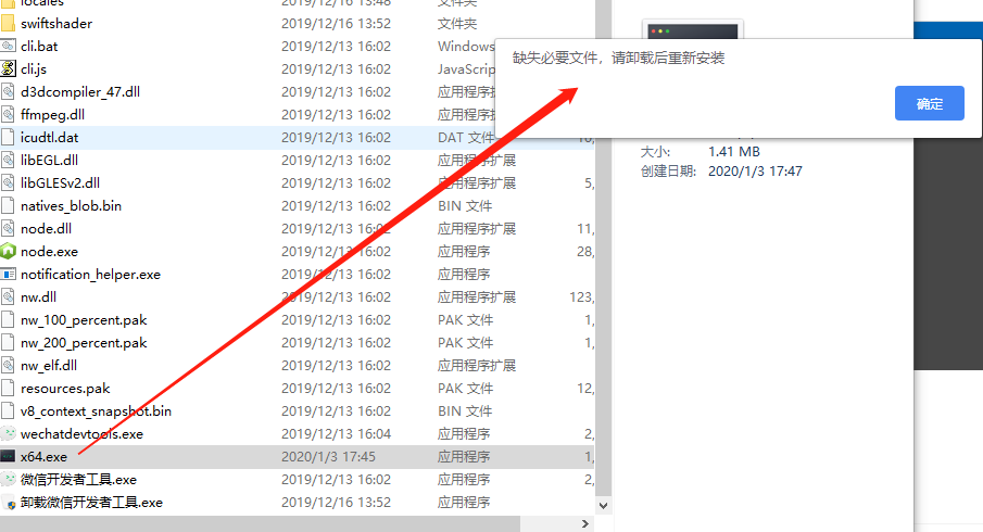 2.点击x64.exe出来个缺失必要文件,请卸载后重新安装