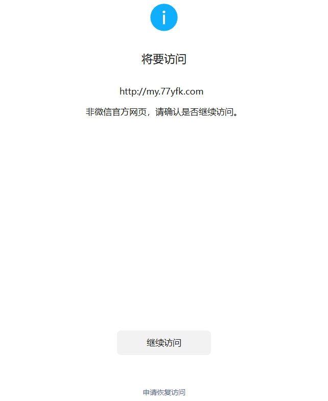 您好,我的域名已进行管局备案,http://my.77yfk.com浏览器访问正常,我是网站开发者,访问时间如图,点开网址提示“非微信官方网页,请确认是否继续访问”经检查网页里没有不安全的内容,请核实后帮忙解除拦截,谢谢!急急急。