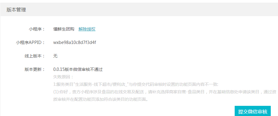 下图这个小程序,授权给我们第三方进行管理,这个小程序用于经营线下便利店、食品配送。已在类目配置中选择类目“生活服务-线下超市/便利店”和“商家自营-食品”(类目设置情况如下图1)。但小程序提交微信审核,一直审核不通过,已被驳回超过3次。驳回理由是:需补充选择商家自营-食品类目(驳回提前见下图2)。明明已经有设置这个类目,为何审核一直说没有设置此类目?简直客服进行人工反馈,客服要求我们来论坛提问(客服回复见下图3),还请各位大神帮忙解疑。