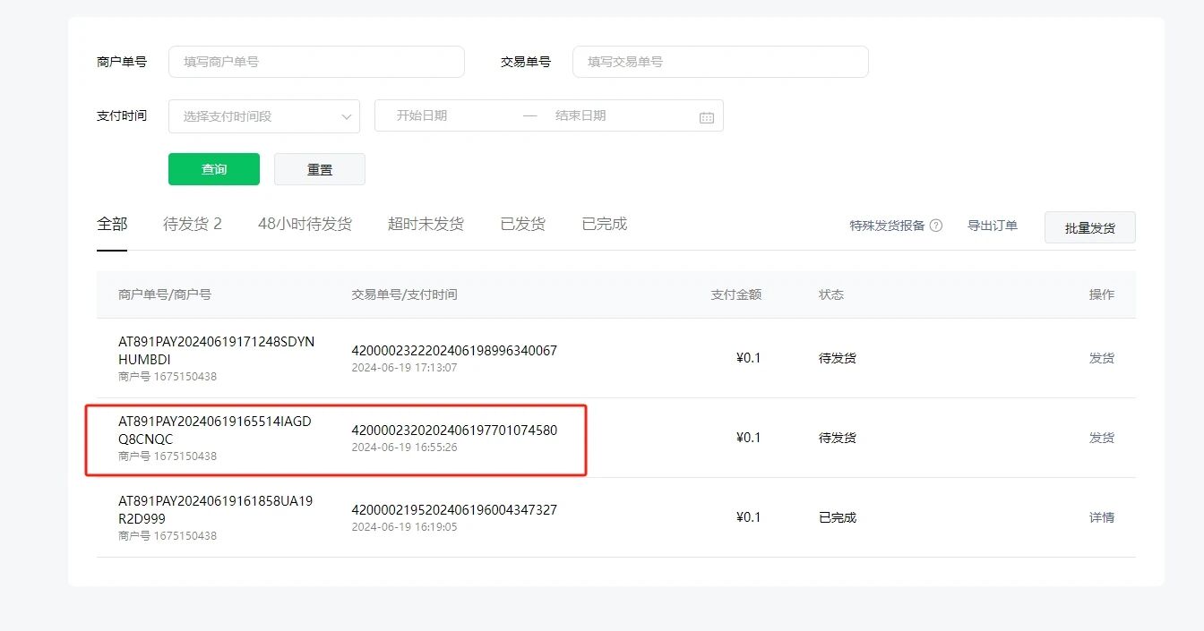 {"delivery_mode":1,"logistics_type":2,"order_key":{"mchid":"1675150438","order_number_type":1,"out_trade_no":"AT891PAY20240619165514IAGDQ8CNQC"},"payer":{"openid":"oq8ES5rexFDaFqoLTdX_Vaz28BMc"},"shipping_list":[{"tracking_no":"202406201735574FGFSJNE","item_desc":"水果-1 ","contact":{"receiver_contact":"+86-135****5661"}}],"upload_time":"2024-06-20T17:35:57+08:00"},平台单号:4200002320202406197701074580,昨天交易的单号,为啥还是不能发货呢?报订单不存在的错,但是在平台发货管理中也看到有待处理的发货记录;