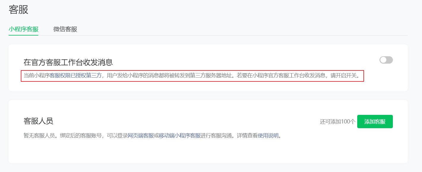 微信小程序客服绑定了第三方"微信对话开放平台",以前小程序中有客服消息是可以体现到"小程序客服消息"盒子的,但是中间换了一次小程序账号,原来的配置丢失了,最新客服配置后,消息没有体现到"小程序客服消息"盒子中了,请问该怎么配置?望指导一下,本人目前纯小白。。