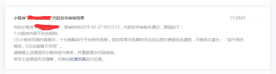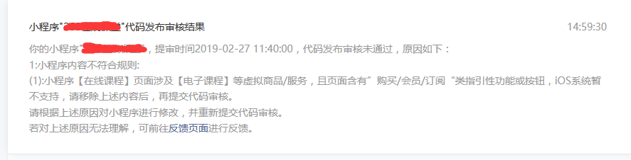 昨天提交 给出的 理由 为: 涉及在线课程直播 和 IOS 虚拟支付,我们去掉了直播模块,并且按官方 要求 对 IOS 支付 做了限制。如下图: