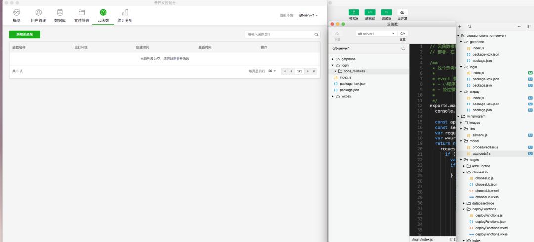 如果申请了公测且已开通,则使用公测版开发者工具时在工具栏左侧会显示 “云开发” 的按钮,即是控制台入口