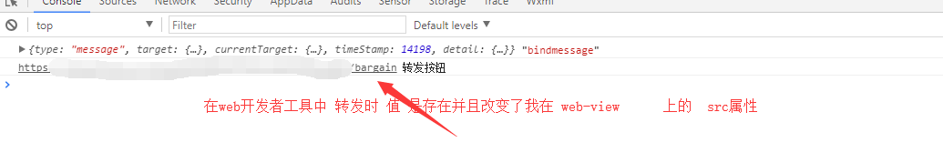 在有web-view 组件中src的 变量。默认是 主页。然后点击转发 会赋值转发当前页面的URL ,在我这边控制台中已经赋值了。 分享给你后。如果你点击的话 还是首页