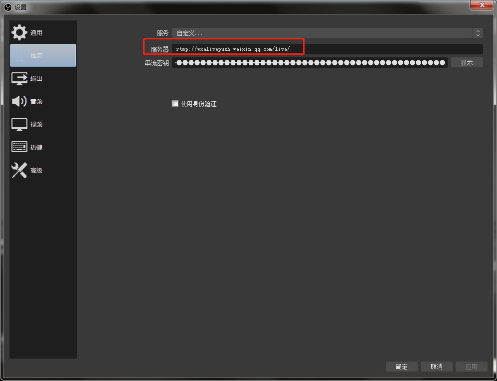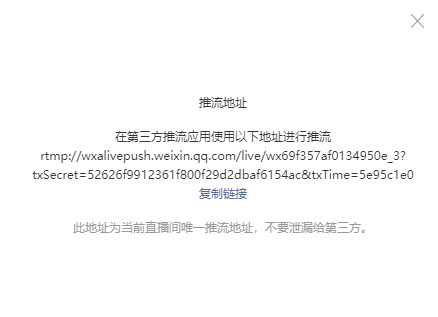 推流地址,是2个部分。服务器地址和密钥要分开。服务器地址:rtmp://wxalivepush.weixin.qq.com/live/ (带后面的斜杠,)地址后面一半就是密钥。