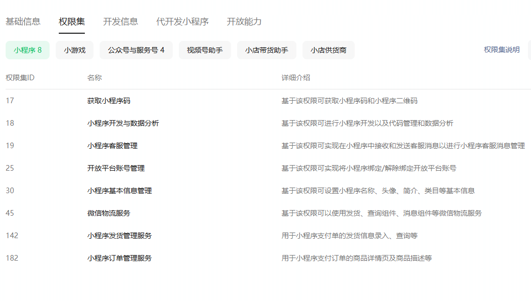权限集对应的文档请参考 https://developers.weixin.qq.com/doc/oplatform/Third-party_Platforms/2.0/product/third_party_authority_instructions.html。