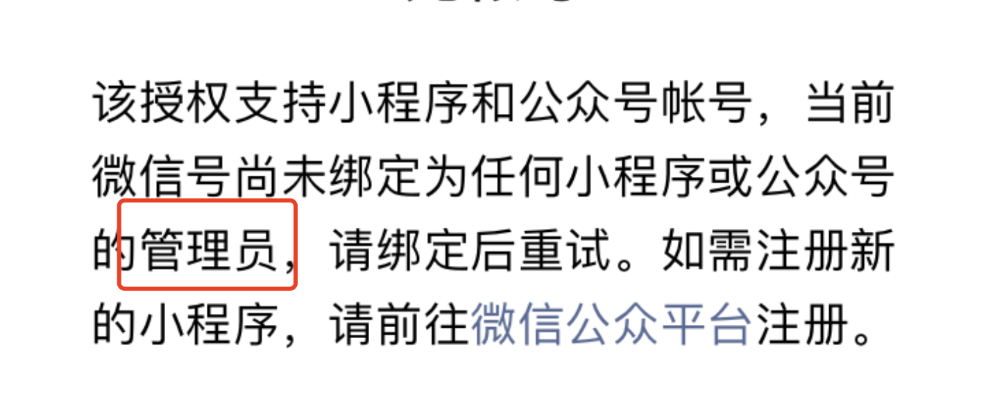 授权需要管理员角色,其他角色都不可以。使用扫码的微信前往公众号「公众平台安全助手」->绑定查询->微信号绑定帐号,查看是否为管理员,页面上有显示。