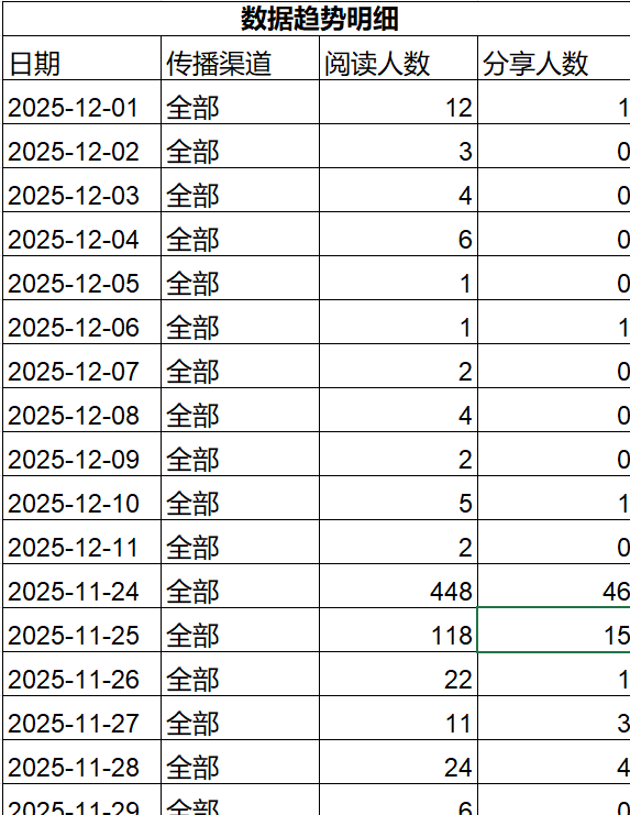 以前的数据表格数据维度很详细,分为阅读人数,阅读次数,分享人数,分享次数。且每个传播渠道都有相应的数据(下图1)。但是今天我下载了数据表格后,发现数据减少了,只有阅读人数和分享人数两个维度,且各个传播渠道的数据(分享数据)都是0, 只有总的分享数据。请问是不是出问题了?